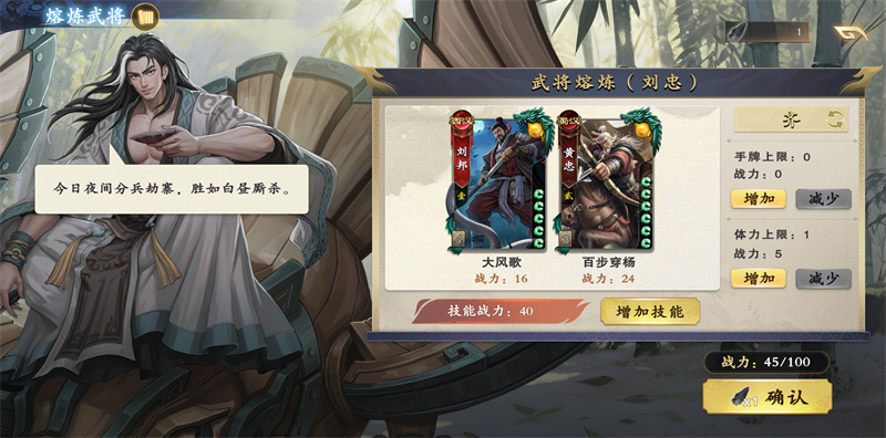 在熔炼界面,只能选择已拥有的武将,可以选择一名武将的“1个技能”。每个武将技能有战力设定,可以多个武将进行熔炼,但要求战力不能超过100。