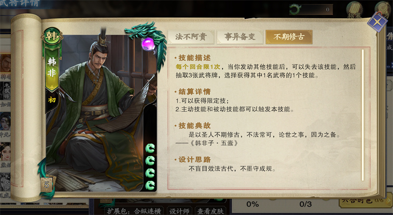韩非有个比较邪道的玩法,就是“不期修古”可以抽取3个武将牌,再选择1名武将的1个技能。