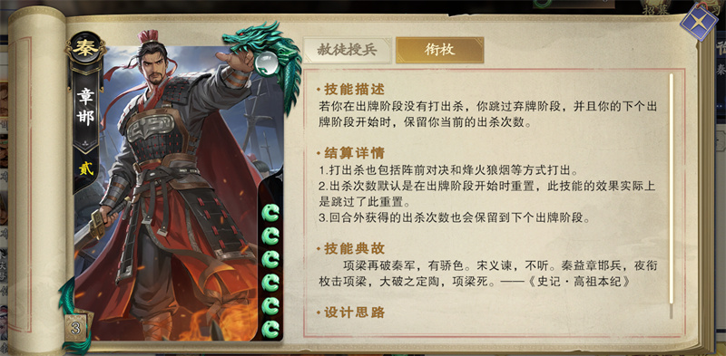 章邯在出牌阶段不出杀,就可以跳过弃牌阶段。我们开局装-1马,或者玄武盾提供保护,接下来就可以一直跳过回合。不出杀,就不用弃牌,就可以一次性把手牌攒满。敌方武将如果出杀,我们就出闪,手牌多就有基础的防御能力。