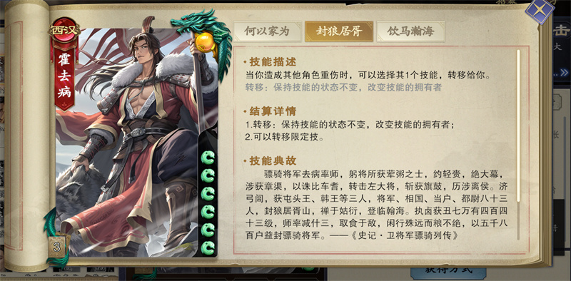 霍去病的封狼居胥在重伤其他角色时,可以选择其一个技能,千里单骑打通后可保留技能状态,所以霍去病可以刷一大堆技能。