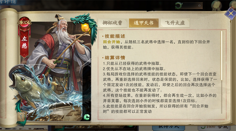 玩韩非需要在第一关一直刷技能,选择比较容易触发的技能,在技能触发后就选择失去,每次随机出3个武将,直到刷出左慈,选择其技能“遁甲天书”。遁甲天书可以在回合开始时获得3个技能,接下来就能“左脚踩右脚”刷出一大堆技能。