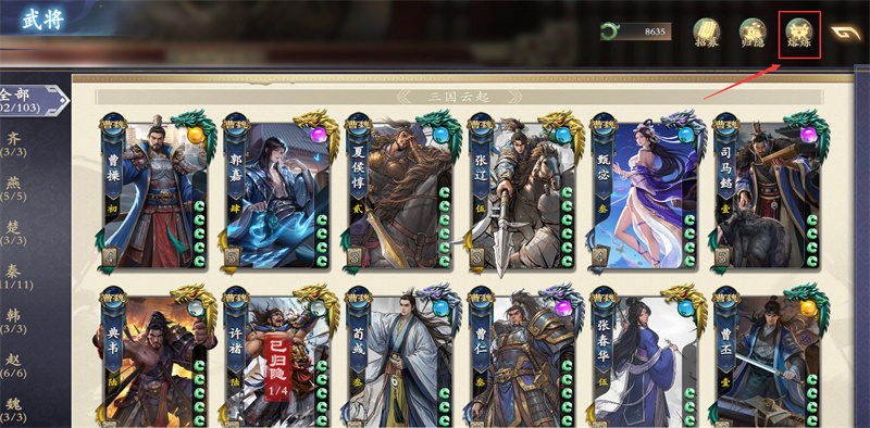 熔炼功能可以在主界面中的【收藏】-【武将】-右上方的【熔炼武将】中进入。